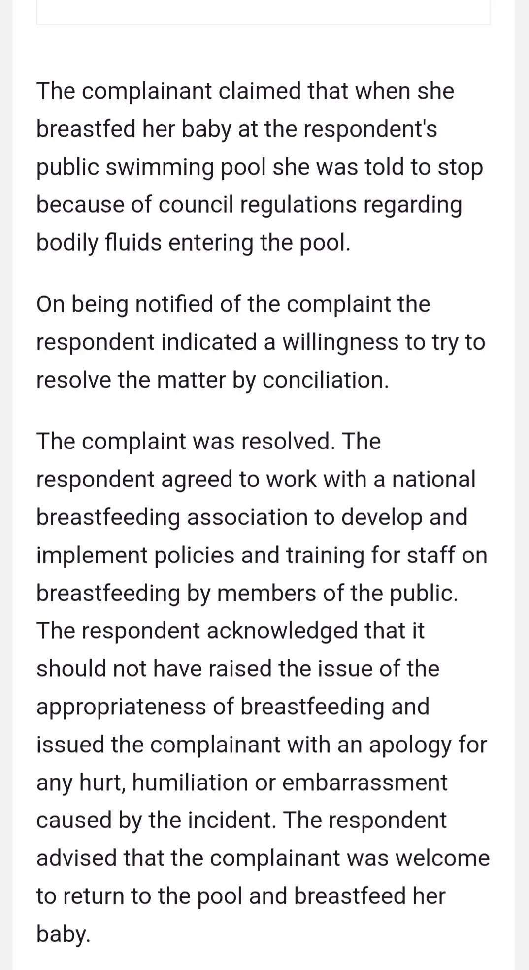 “In the past, ABA is aware that some mothers have been told to cease breastfeeding at public pools due to council regulations regarding bodily fluids entering the pool. A precedent regarding this was set in 2011 when a mother’s complaint was conciliated by the Human Rights Commission. In this case, the management of the public pool issued the mother an apology, undertook appropriate training for their staff and changed their policy and practice in this area.”