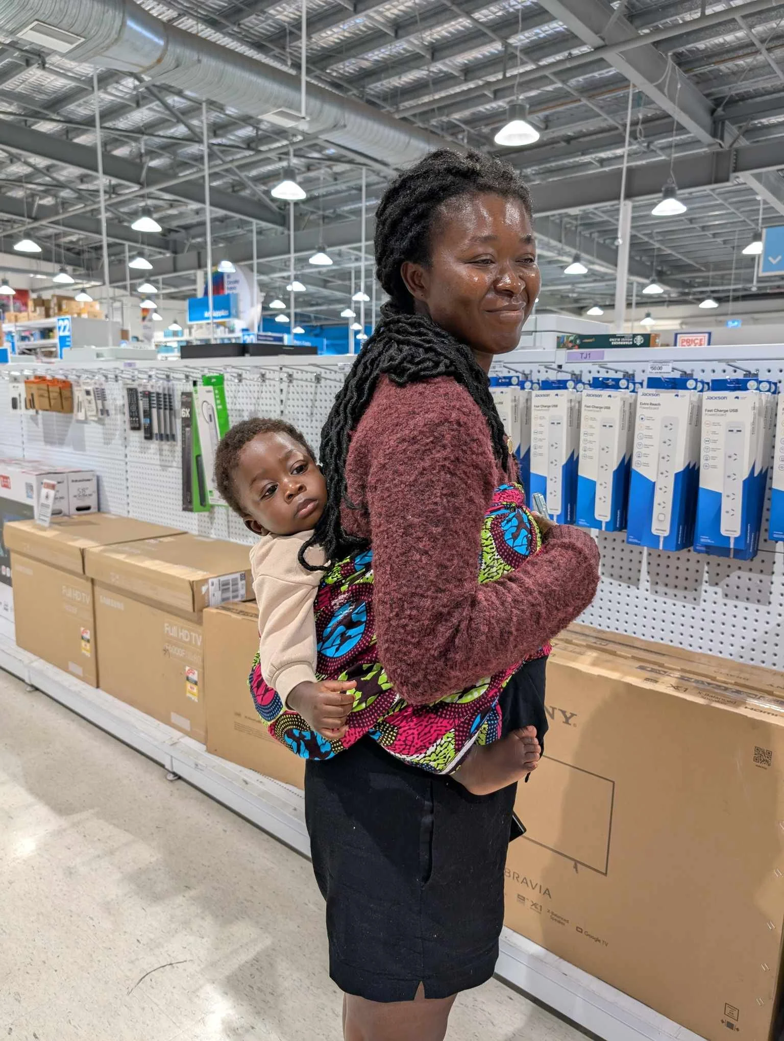 A smiling mother shops with her child carried high on her back in a boldly patterned cloth, wrapped in the traditional kanga or wrapper style. The vibrant fabric contrasts with the modern retail setting, bridging cultural heritage and everyday life.