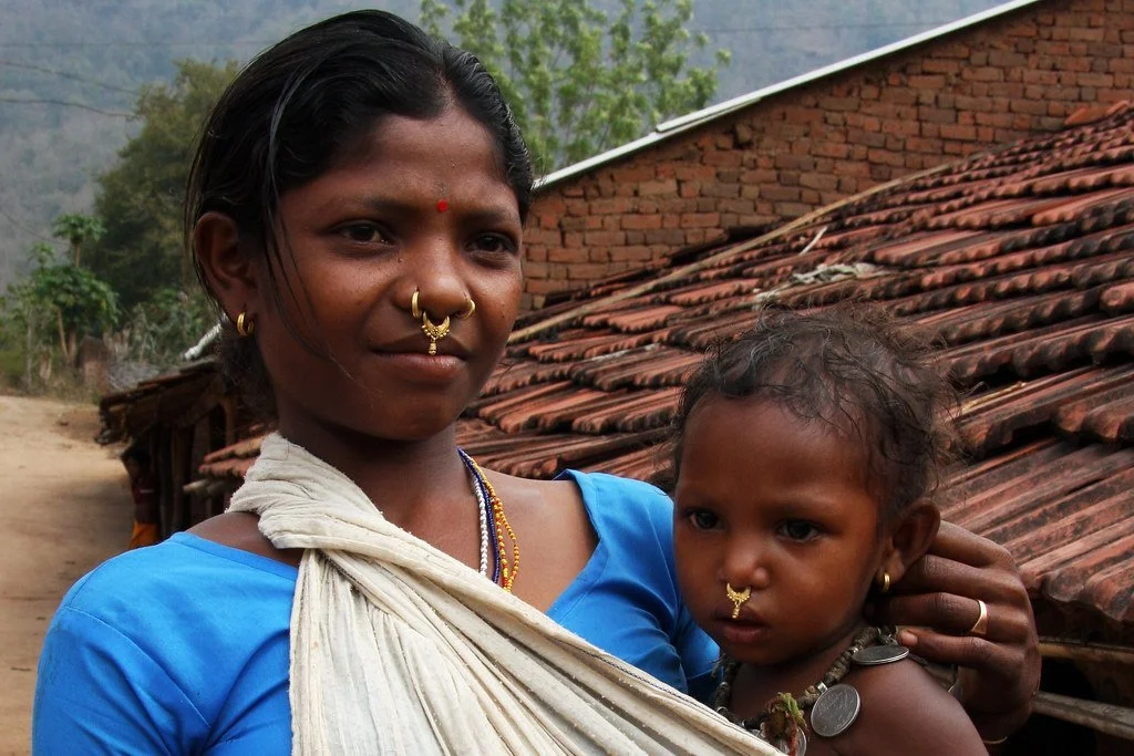 An Adivasi mother in rural India stands proudly with her young child resting on her hip, supported by a length of cloth tied over one shoulder. Both wear traditional jewelry, including striking gold nose rings. The clay-tiled rooftops and hillside backdrop root this moment in a village setting, highlighting the continuity of Indigenous caregiving practices.