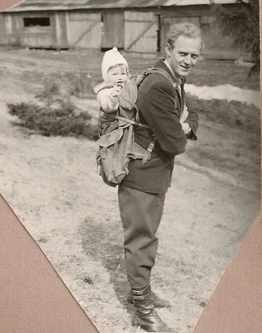 This wonderful vintage photograph shows a man proudly carrying a baby in an early framed backpack-style carrier, likely from the 1940s or 1950s.