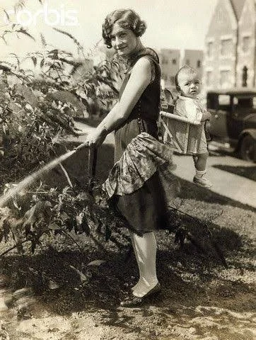 This charming photograph from the 1920s or early 1930s shows a fashionable woman watering her garden while carrying her baby in a wooden framed back carrier.