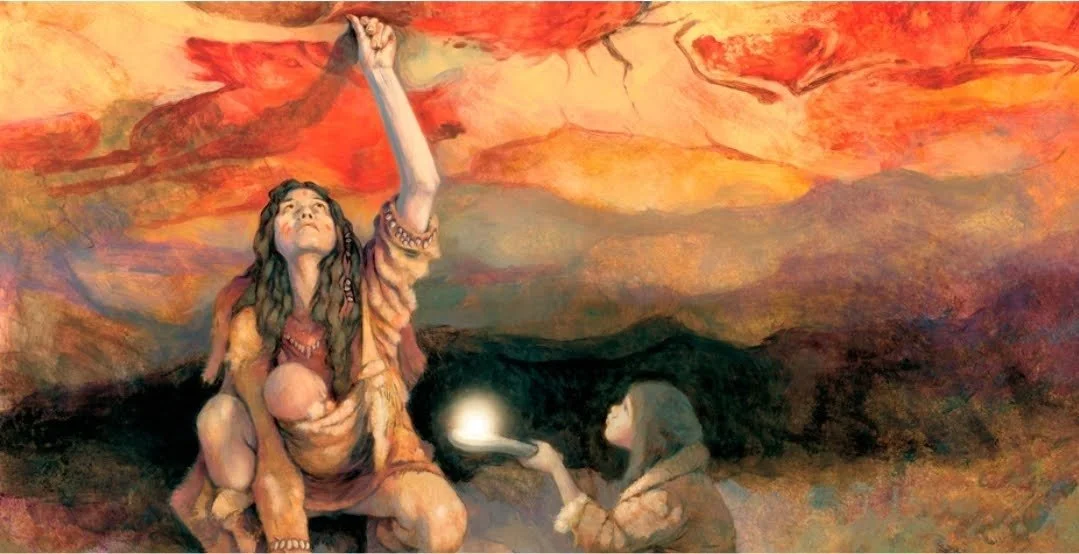 Artwork by Luba Lukova, featured by the Museo de Ecología Humana. This striking image reimagines a prehistoric woman as both artist and mother — creating cave art while carrying her baby and supported by a child holding light. It reminds us that women’s creative and caregiving roles have always been deeply interwoven, shaping culture and knowledge in ways often overlooked by history.
