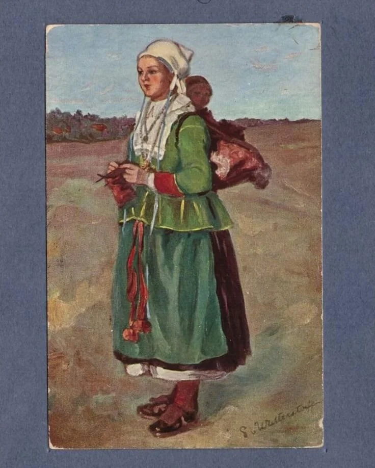 A woman stands in an open field, her hands calmly knitting as she gazes toward the distance. She wears a traditional outfit — a green skirt with red and white trim, a peplum-style bodice, and a white cap tied beneath her chin. Ribbons hang from her waist, and her posture is steady and at ease.