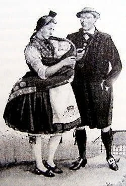 The man beside her wears a tailored jacket and knee-length trousers with tall socks and a hat — likely a depiction of folk or ceremonial dress from regions such as Hungary, Slovakia, or southern Poland. Together they stand calmly, their posture composed, the baby carried as naturally as any other part of the outfit.