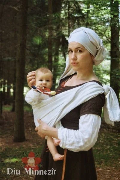 This beautiful photograph evokes medieval European traditions of babywearing, where simple linen or wool cloths were skillfully tied to carry infants close. In historical European contexts, carrying was deeply practical — allowing mothers to work the fields, tend hearth fires, and move through markets while keeping their babies safe and comforted. The plain, natural fibers reflect a time when fabric was precious and every stitch counted. In reenactments today, these simple slings reconnect us to ancestral practices of closeness and resourcefulness, reminding us that babywearing has always been part of daily life across every corner of the world.