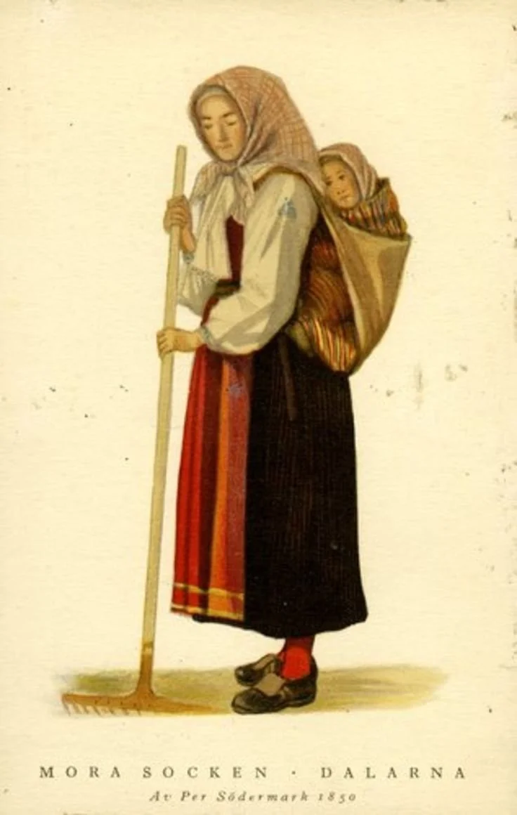 This is babywearing as part of traditional Swiss life — not separate from the garments, but woven into them. The carrying cloth is not highlighted as something apart, but made to match and function with her dress. The child rests comfortably within the frame of heritage, community, and conversation.