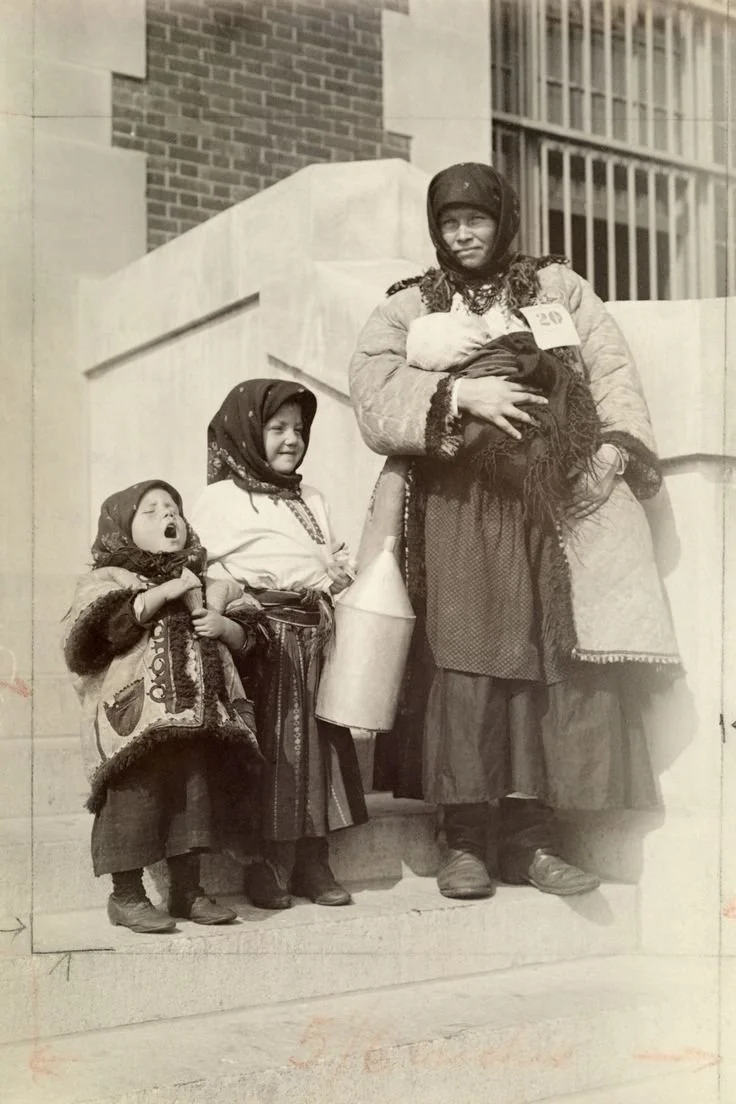 This poignant early 20th-century photograph shows an Eastern European immigrant mother standing on the steps of Ellis Island with her three children.