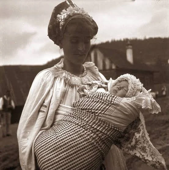This beautiful historical photograph shows a woman from the Carpathian region of Eastern Europe, possibly Poland, Slovakia, or Ukraine, carrying her baby on her back in a traditional woven cradle bag or torba. Suspended from a sturdy shoulder strap, this simple but effective carrier kept babies safe and close while allowing mothers to continue with daily work. The woman’s white head covering and delicately embroidered blouse reflect the cultural richness and textile traditions of her community. The baby, warmly dressed with a bonnet and lace collar, looks out at the world from a place of comfort and connection. This image beautifully captures how practical, resourceful babywearing has always been deeply woven into daily rural life and cultural identity."