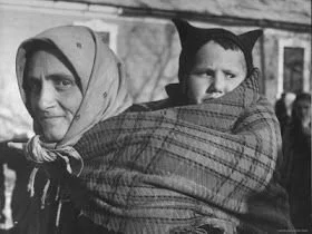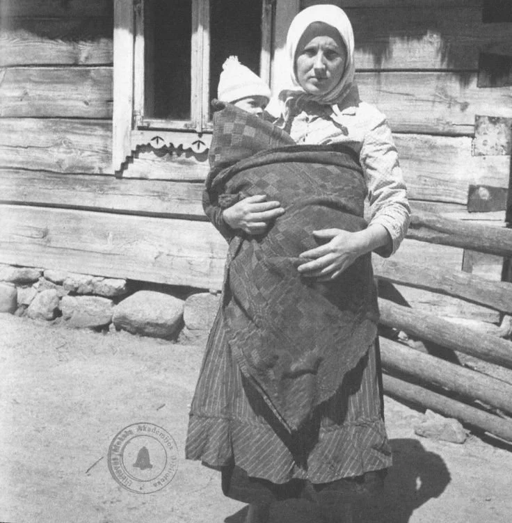 This powerful historical image captures a mother from Eastern Europe — perhaps Ukraine, Poland, or Russia — carrying her child on her back in a large woven blanket. With a simple, practical wrap, she keeps her little one snug and warm against her body, protected from the harsh cold. The child's charming hat, with its pointed 'ears,' adds warmth and a touch of character, echoing regional styles that have been passed down through generations. Babywearing here is not only about transport; it is an act of care and resilience, connecting mother and child in the face of daily challenges and reminding us of the enduring strength of these traditional practices."