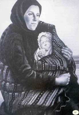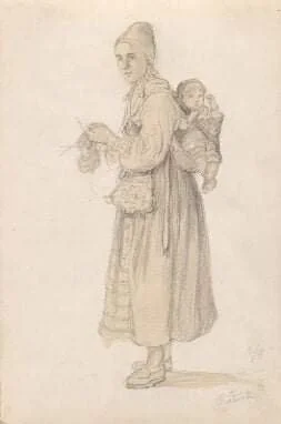 This delicate sketch beautifully captures a mother from Eastern Europe (possibly Poland or Slovakia), carrying her baby on her back while knitting — a familiar, tender scene reflecting daily life. The wrap is tied securely, keeping the baby close and safe while allowing her hands to stay busy. The fine lines of the drawing highlight the texture of her layered clothing and the careful, practical way the fabric supports the child. It's a timeless reminder of mothers' incredible multitasking skills and the deep-rooted tradition of keeping babies close throughout everyday work.