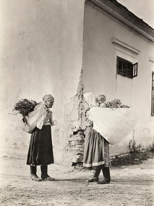 Their long skirts, aprons, and headscarves reflect regional peasant attire, designed for modesty and utility. The whitewashed building and exposed brick suggest a typical village scene from the late 19th or early 20th century, when most women worked outdoors and carrying solutions had to adapt to heavy labor and long distances.