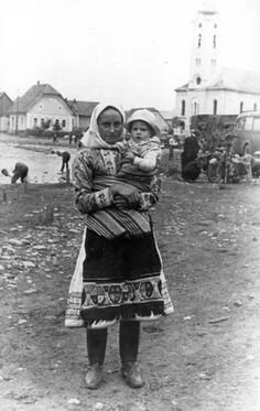 "This beautiful portrait captures a Hungarian mother in traditional dress, her baby securely wrapped on her front with an embroidered cloth carrier known as a kendő. The striking floral patterns and lace detail highlight the rich textile heritage of Hungary, where regional embroidery and strong family traditions go hand in hand. The kendő is not only practical for keeping a baby close but also an extension of cultural identity and pride. Beside her stands an older child, adding to the sense of family continuity and connection. This image celebrates generational care, craftsmanship, and the deep bond between mother and child."
