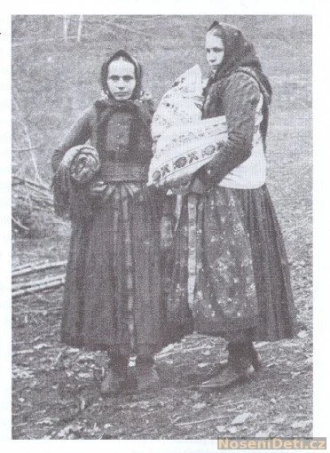 This evocative historical photograph shows two women from the Czech Republic or Slovakia dressed in traditional folk costumes. The woman on the right carries her baby in a front wrap, snugly swaddled and secured with a beautifully embroidered cloth — reflecting both practicality and the deep cultural pride in textile arts. Her companion holds what appears to be an extra blanket or carrying cloth, emphasizing the importance of keeping little ones close and warm in all seasons. Their layered skirts, aprons, and headscarves highlight the richness of regional dress traditions. This image beautifully captures how babywearing has long been woven into the rhythms of daily life and community in Central and Eastern Europe."