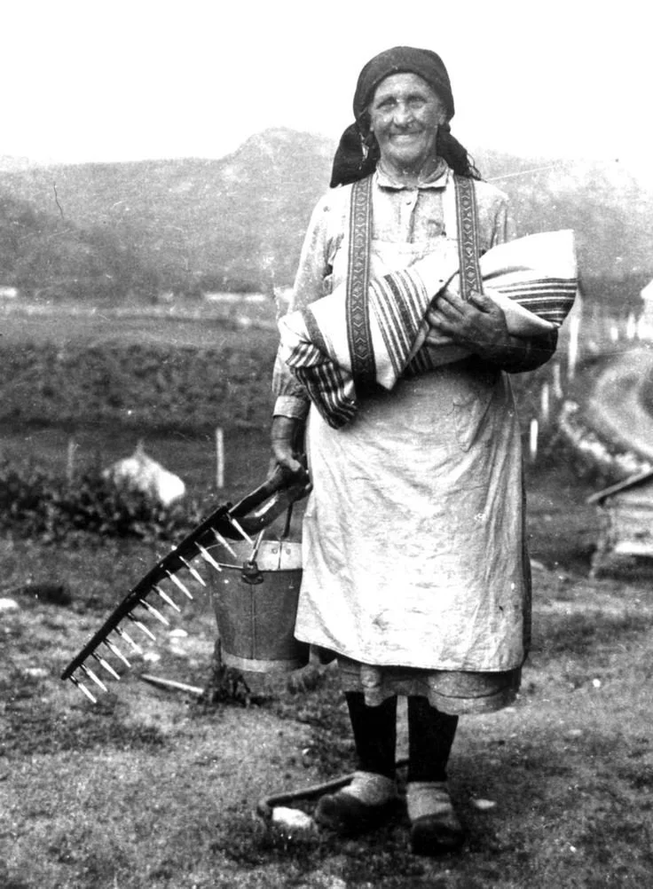 "This striking historical photograph shows an older rural woman, likely from Eastern Europe or the Carpathian region, carrying an infant in a beautifully woven and embroidered cloth wrap. The baby is held securely against her chest, wrapped in regional textiles that speak to deep local traditions of weaving and handcraft. The woman also carries a rake and a pail, a reminder that tending to children and tending to the land often went hand in hand. Her layered skirt, sturdy apron, and headscarf reflect practical rural dress, while her strong smile radiates warmth and resilience. This image beautifully captures how babywearing has always been a seamless, loving part of working life, embodying both cultural pride and maternal devotion."