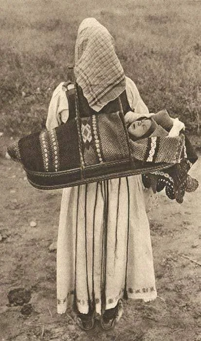In this evocative historical image, a rural Eastern European woman carries her child inside a large woven or cloth bundle on her back — an improvisational carrying method that highlights the ingenuity of village life.