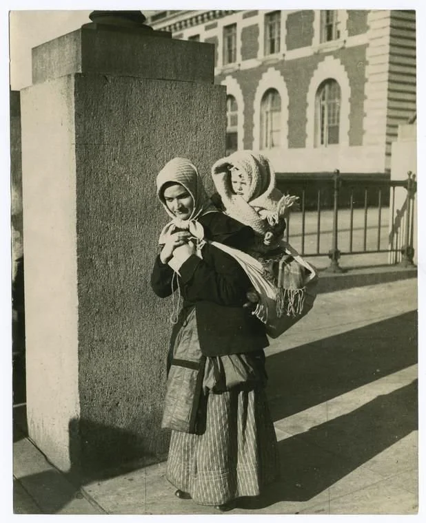 "This striking photograph shows an Eastern European immigrant mother arriving at Ellis Island in the early 20th century, her child securely carried on her back in a large woven shawl. Rather than a formal carrier, she improvises with what she has — a testament to the resourcefulness and care central to babywearing traditions across cultures. The baby is bundled in extra scarves and a bonnet, ensuring warmth and safety on this long, uncertain journey. Her layered skirt, apron, and headscarf reflect the rural European dress of the time, signaling her roots and resilience. This image beautifully captures a moment of transition: carrying the old ways into a new world, all while keeping her child close."