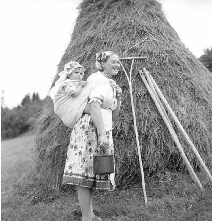Across Eastern European fields, mothers wrapped their children in simple cloths and stepped out to tend to farm and family. Here, a mother smiles beneath her patterned headscarf, her child peeking curiously from a linen sling tied snugly around her shoulders. Between the sweep of hayfields and the clang of milk pails, the baby learns the rhythms of village life and the strength of a mother’s laughter. In each fold of fabric and every soft sway, we find the same quiet promise: you are carried, loved, and woven into the heart of home and land.