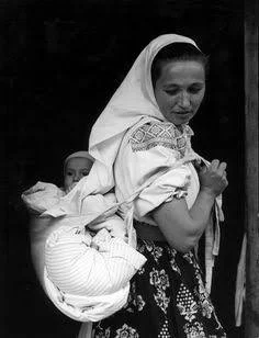 This beautiful historical photograph shows a mother from Eastern Europe — likely Romania or Slovakia — carrying her baby on her back in a traditional cloth wrap, often called a šatka or shawl. Her embroidered blouse and headscarf reflect the rich textile traditions and folk artistry of her region. The baby is securely wrapped, sitting high and close against her back, allowing for safety and warmth while she goes about her day. This image perfectly captures the enduring beauty of babywearing as an act of care, connection, and cultural expression, reminding us of the quiet strength and love carried from one generation to the next.