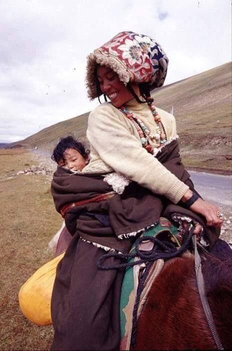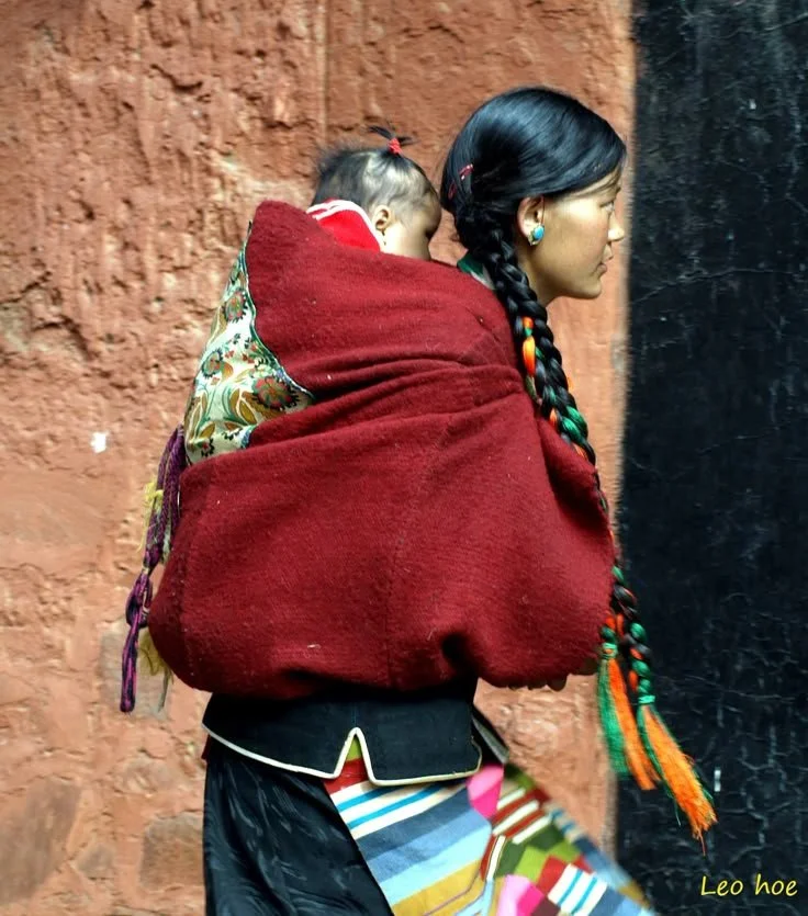 This striking image shows a Tibetan mother carrying her baby in a richly layered traditional wrap. In Tibetan culture, babies are often secured on the caregiver’s back using warm, thick cloths and intricately decorated textiles that reflect the region’s deep connection to color, symbolism, and spiritual life. The baby rests snugly against the mother, sharing her body warmth while moving through high mountain villages or bustling monasteries. The bright woven tassels and carefully braided hair express both beauty and cultural pride. To be carried this way is to be enveloped in warmth, protected by family traditions, and introduced to the world from a place of security and love.
