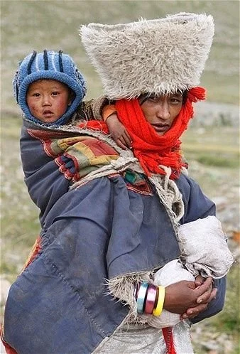 This Tibetan mother carries her child across the vast, windswept plateau, wrapped in thick layers of wool and fur that echo the strength and warmth of her embrace. In Tibetan culture, babies and young children are secured high on the caregiver’s back using woven sashes and wide bands, often lined with sheepskin for insulation against the biting cold. Each colorful fabric and intricate accessory reflects regional artistry and the family’s connection to the highland earth. To be carried in Tibet is to feel the expansive sky overhead, the steady rhythm of a mother’s steps, and the unwavering bond that ties child, caregiver, and land into a single, shared breath.