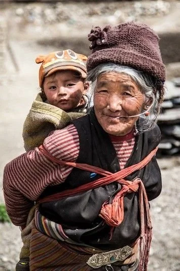 This tender image captures a Tibetan grandmother carrying her grandchild on her back, wrapped securely in a woollen blanket and wide sash across her chest. In Himalayan communities, babywearing is not only the work of mothers but a shared act of care by elders and extended family. Grandmothers play a vital role in raising children, passing on stories, songs, and wisdom through each gentle sway. The layered clothing, earthy textiles, and deeply lined smiles tell of resilience and warmth in the harsh mountain climate. To be carried in this way is to be woven into generations of love, supported by strong backs and even stronger hearts.