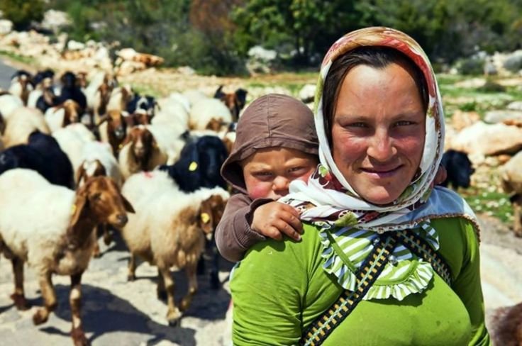 This vibrant image captures a mother from a rural pastoral community in Anatolia or the Middle East, carrying her child on her back while tending a herd of goats. Wrapped simply but securely, the baby sits high and close, curiously watching the world over her mother’s shoulder. Her bright headscarf and lively green top reflect the rich colors and practical styles of the region. This beautiful scene illustrates how babywearing supports the blending of nurturing and work, allowing mothers to stay connected to their children while fully engaged in daily pastoral life — a timeless expression of love and resilience."