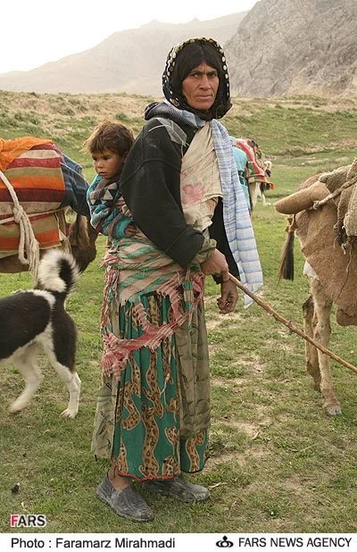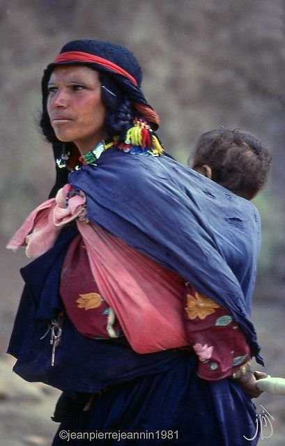 This mother, likely from the Qashqai nomadic people of Iran, carries her child on her back using a long cloth tied around her shoulders and waist. Among many nomadic and rural communities in Iran, especially the Qashqai and Bakhtiari, babywearing is practical and essential for moving through mountainous terrain while tending to flocks and daily tasks. The child is secured snugly but simply, in a style similar to a traditional wrap or shawl, allowing close contact and flexibility. The mother’s layered and patterned clothing, along with the pastoral setting, reflects the rich cultural identity and strong connection to land and movement typical of Iran’s nomadic groups.