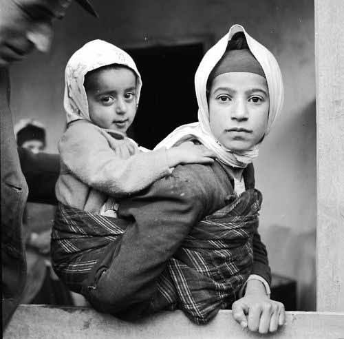 This striking black-and-white photograph shows a young girl carrying her sibling on her back using a simple cloth wrap, somewhere in the Middle East or North Africa. Both children wear head coverings, which can be seen in various rural and traditional communities across this broad region. The wrap is tied firmly around the older child’s waist and shoulders, keeping the younger child securely against her back. This method of carrying, sometimes called a torso carry or blanket carry, is a practical solution that has been used for centuries to allow older siblings (and mothers) to help care for little ones while remaining active. It highlights the strong familial bonds and shared caregiving practices that are common in many traditional societies.