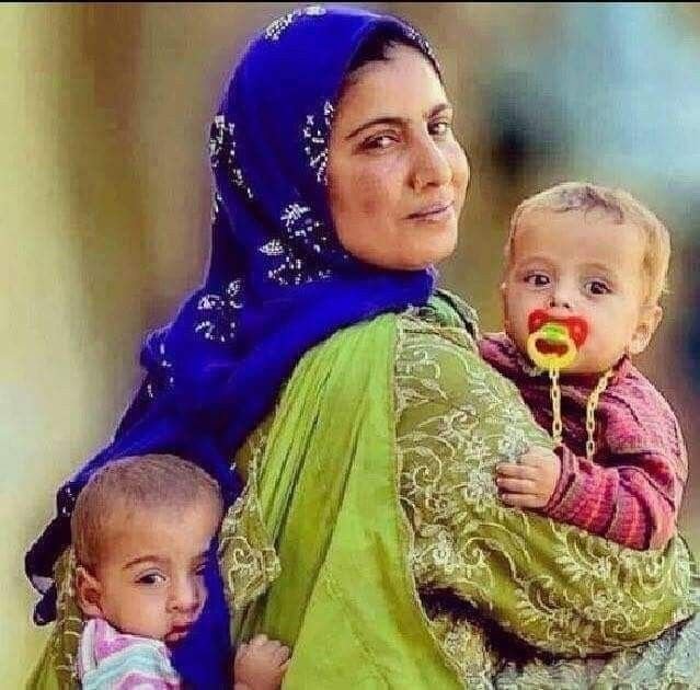 Beside her, another woman sits on the ground, her face also veiled, and her child who rests contentedly in her lap. Her white outer wrap drapes around them both.