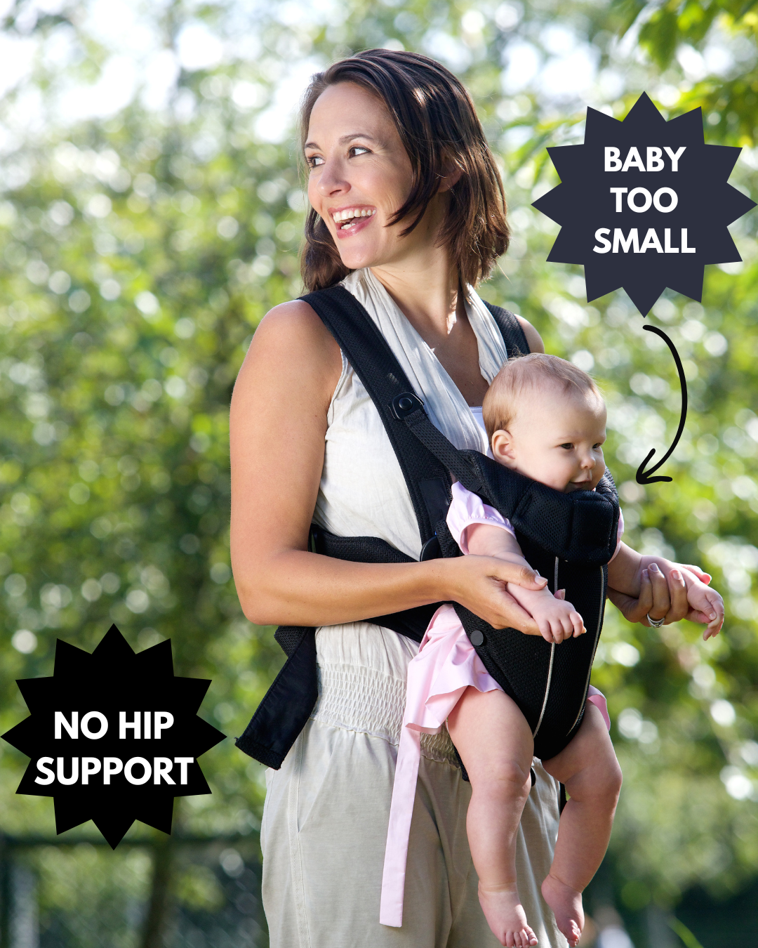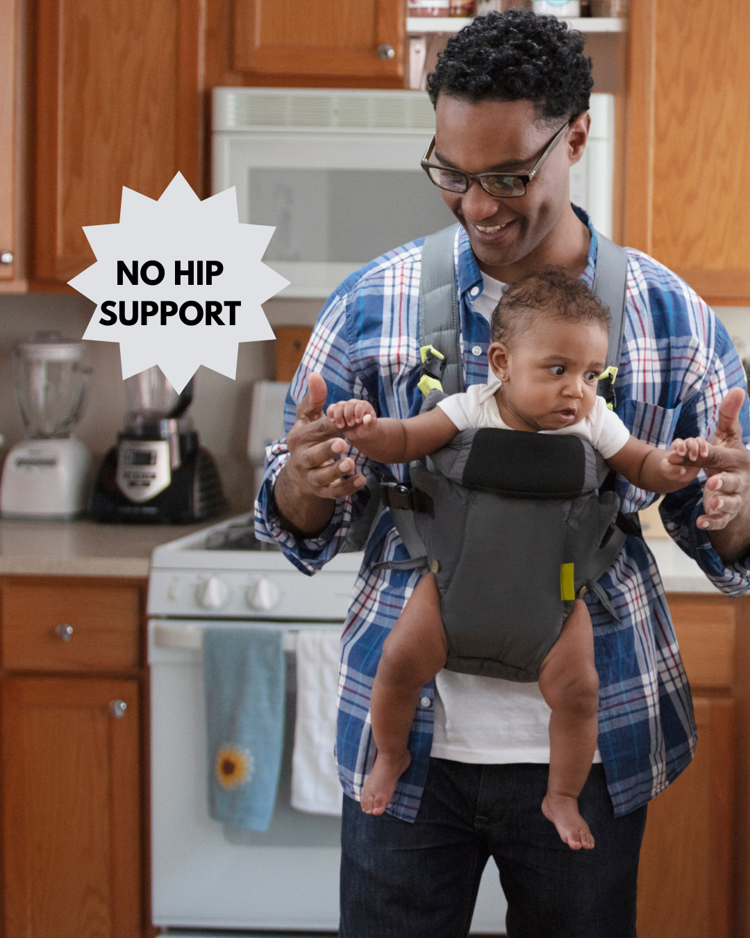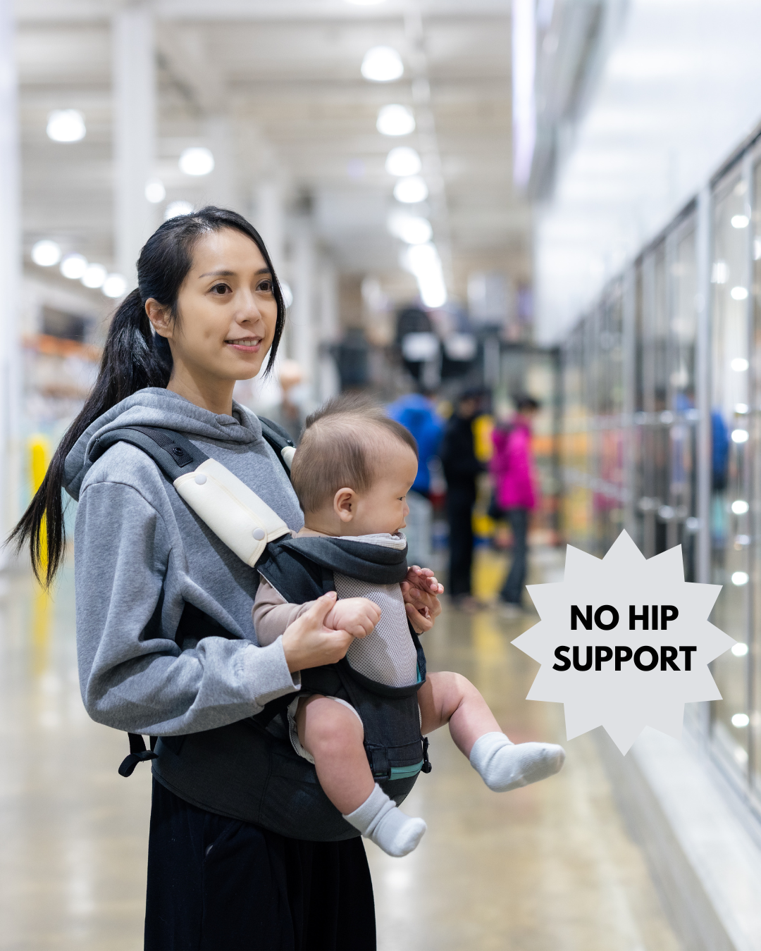 This carrier allows baby’s legs to dangle without proper support — placing pressure on the hips and spine.