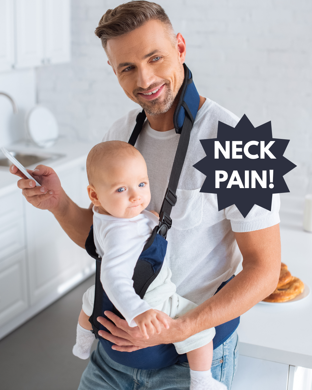 The baby’s weight pulls forward, creating strain that can lead to headaches, muscle fatigue, and long-term discomfort.