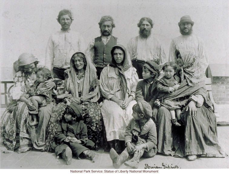 A Romani family sits together for a formal photograph, likely taken during immigration processing at Ellis Island in the early 20th century. The image is held in the public archives of the National Park Service and originally labelled “Slovian Gypsies” — a term reflective of the period, but now understood to carry bias. Here, we recognise them with respect as a Romani family in transition, pausing for documentation as they arrive in a new country. The family forms a quiet circle of strength: four men stand behind, while three generations of women and children are seated in front. On either side, two mothers hold their children close — one cradling a toddler wrapped in cloth against her body. The shawls, long skirts, and layered clothing reflect both cultural tradition and practical travel dress.