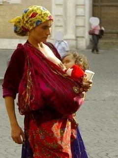 A Romani woman walks through a European city square, carrying her toddler in a deep cloth sling tied over one shoulder. The wide, gathered fabric forms a pouch-like seat for the child, who breastfeeds comfortably while nestled close to her chest. The sling, a richly coloured woven wrap with decorative stitching, is paired with a floral headscarf and layered skirts — clothing often associated with traditional Romani dress. This style of babywearing allows for both mobility and responsive feeding, supporting a close connection between mother and child even in the midst of busy urban life. The image captures a moment of instinctive caregiving among the Romani people of Central and Western Europe, where carrying children in simple wraps or slings remains part of everyday practice for many families.