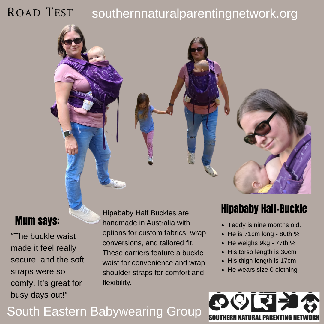 Hipababy Half Buckles are handmade in Australia with options for custom fabrics, wrap conversions, and tailored fit. These carriers feature a buckle waist for convenience and wrap shoulder straps for comfort and flexibility.