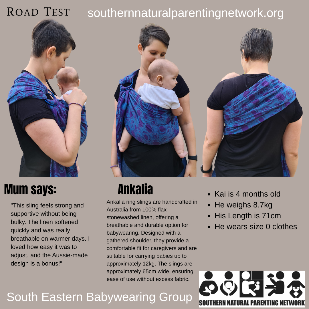 Ankalia ring slings are handcrafted in Australia from 100% flax stonewashed linen, offering a breathable and durable option for babywearing. Designed with a gathered shoulder, they provide a comfortable fit for caregivers and are suitable for carrying babies up to approximately 12kg. The slings are approximately 65cm wide, ensuring ease of use without excess fabric.