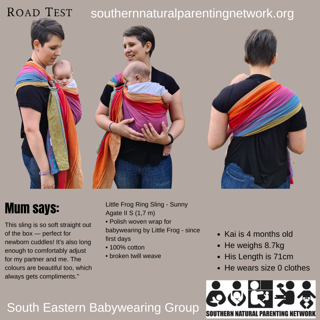 Little Frog ring slings are made in Poland from woven wrap fabric in various blends and weaves. The Sunny Agate II is 100% cotton in a broken twill weave. Sized at 1.7m, it’s soft from the first use and suitable from newborns through toddlerhood.